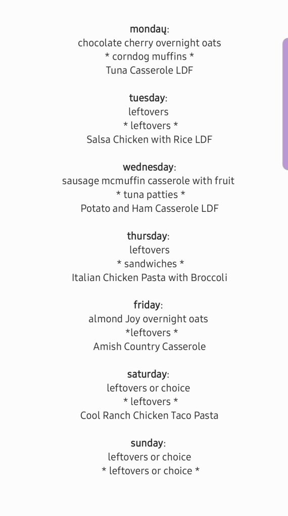 Some of the meals from last week ended up rolling over to this week. It was a busy week, and some meals didn’t get made, so rather than a whole new meal with ingredients to buy, I just added those meals to this week.